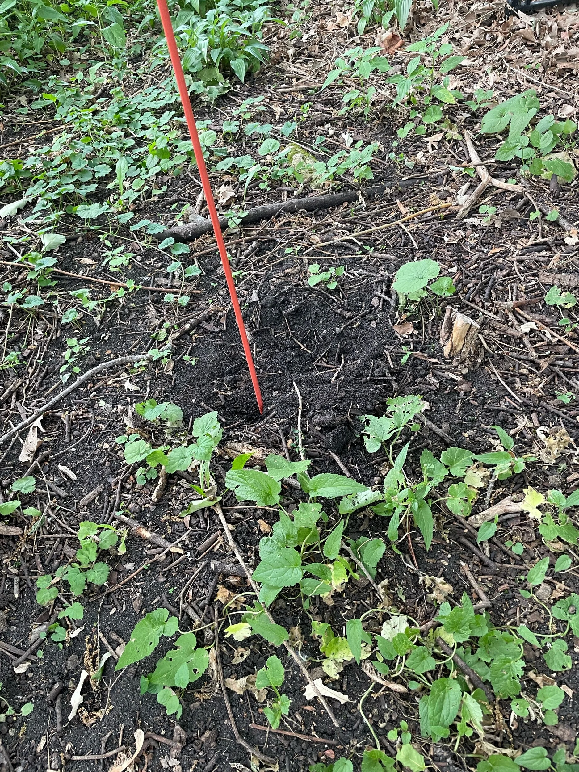 Below, the remains of my recently planted, deer and rabbit resistant shrubby St. John’s Wort. Someting not only chewed it off, but actually dug it out. Meanwhile I have to continually battle with volunteer mulberry and buckthorn.
