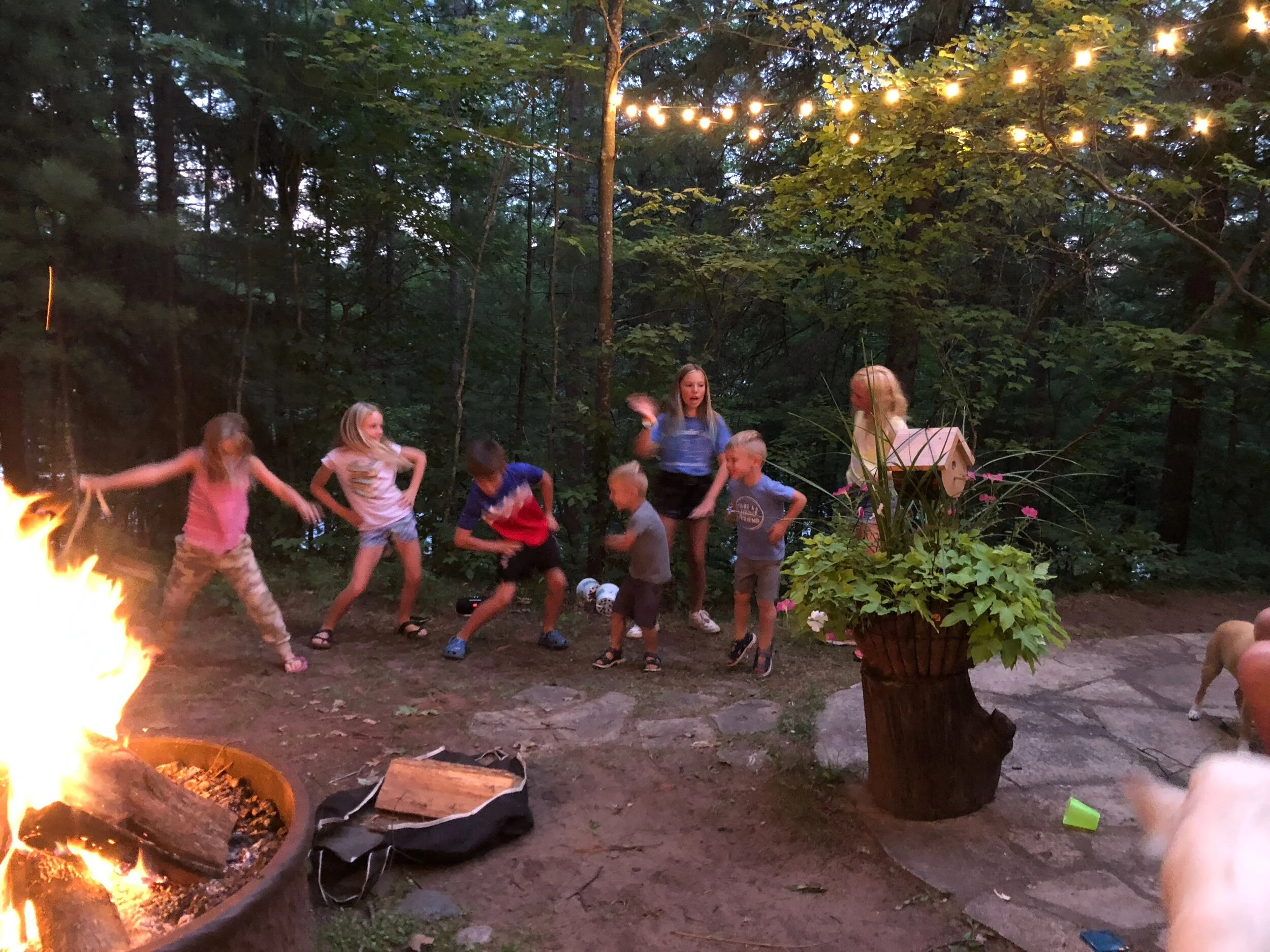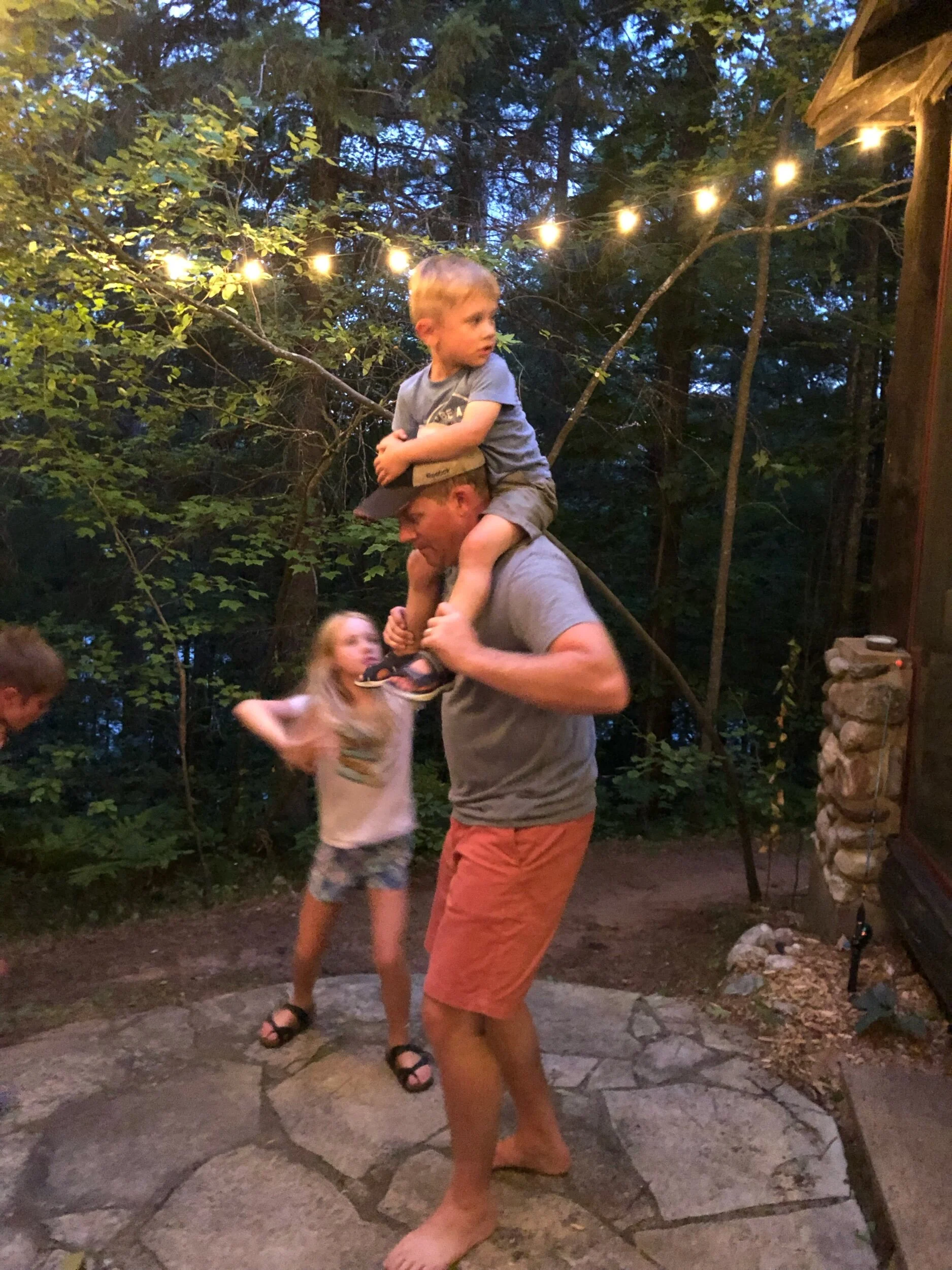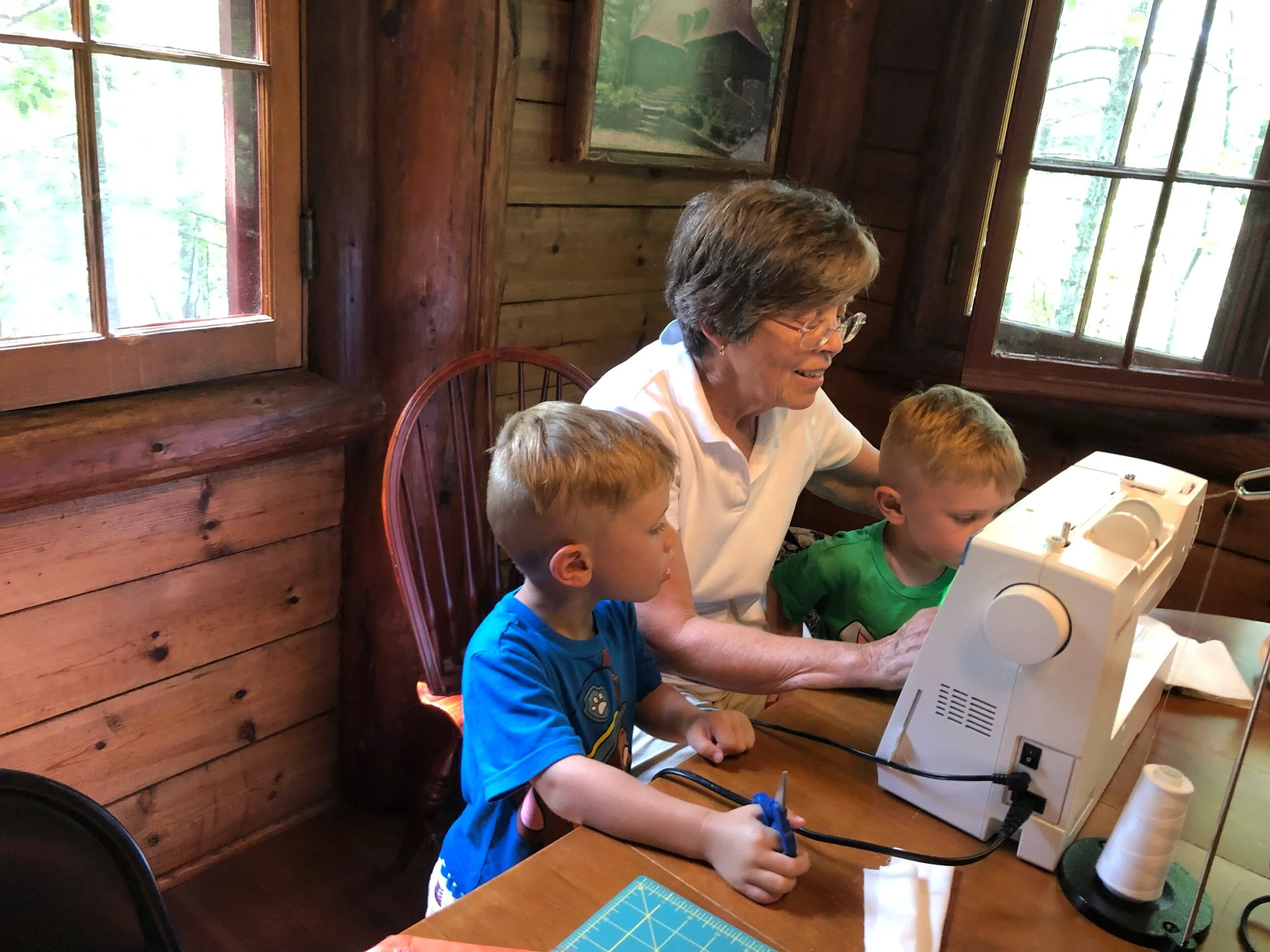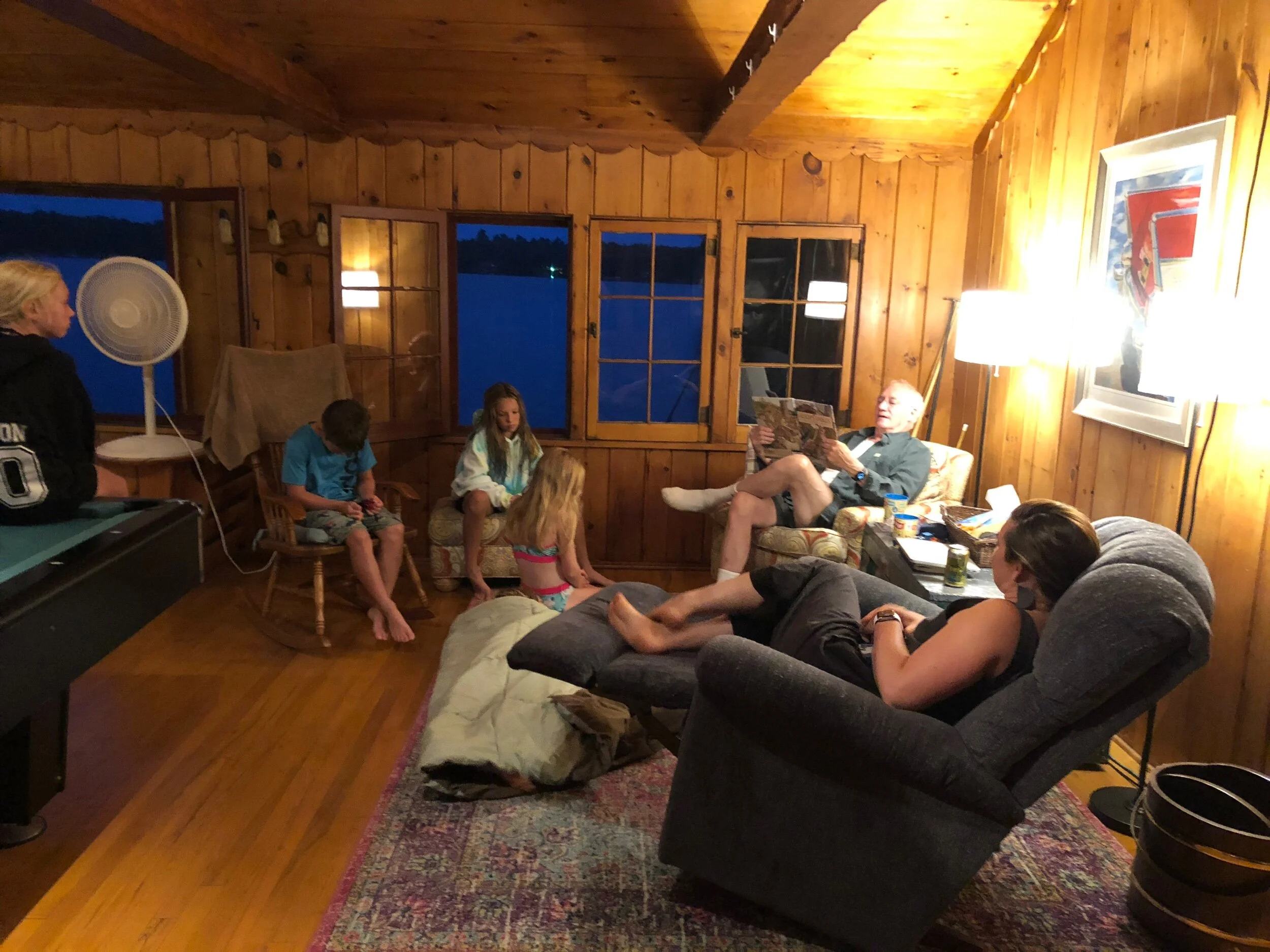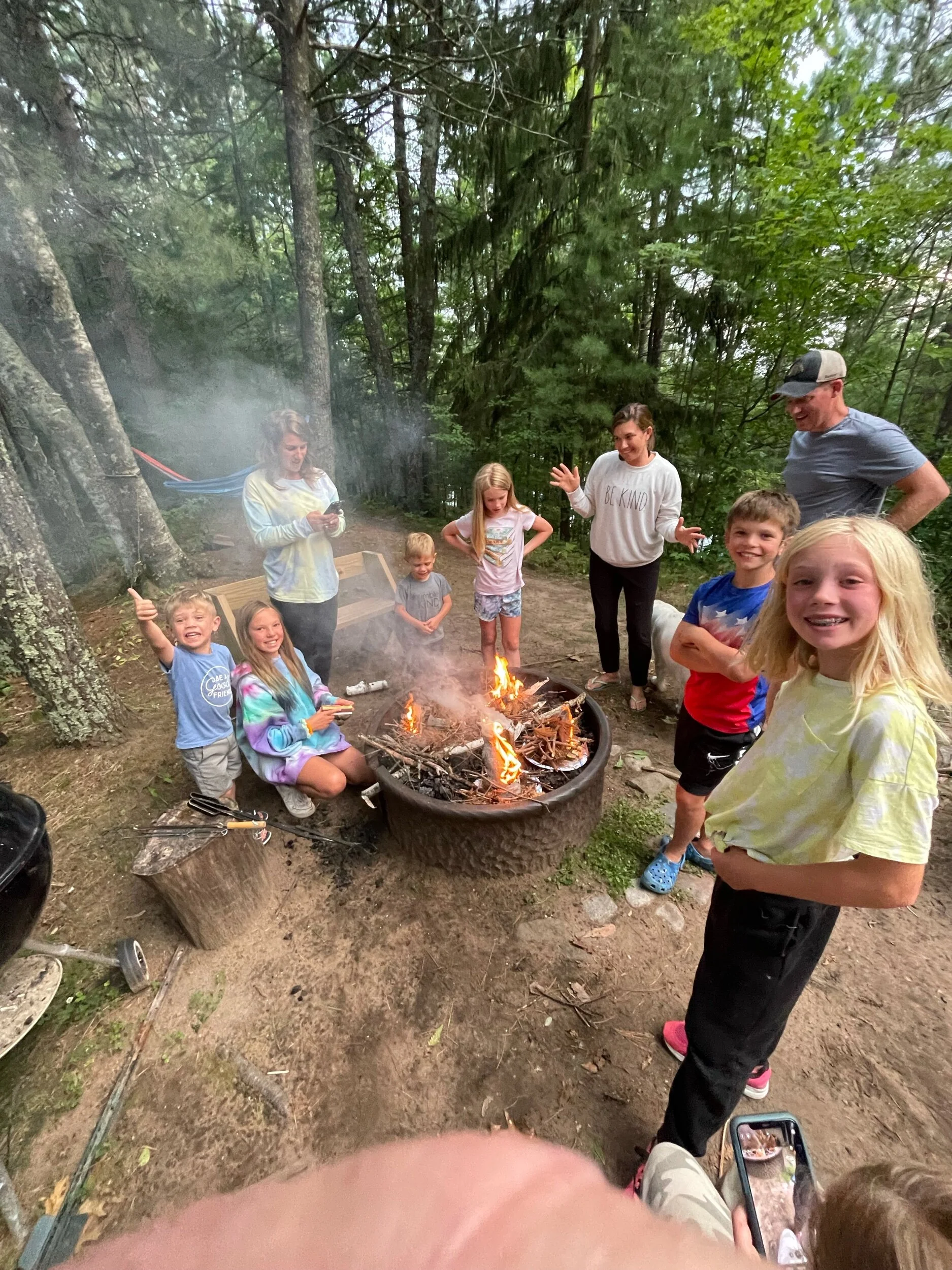 Abby and I on an early morning 18 mile bike ride on one of the Manitowish Waters trails. Later, rowing and swimming. With Mimi—sewing. Still later, geocaching, campfire starting, followed by home movies.