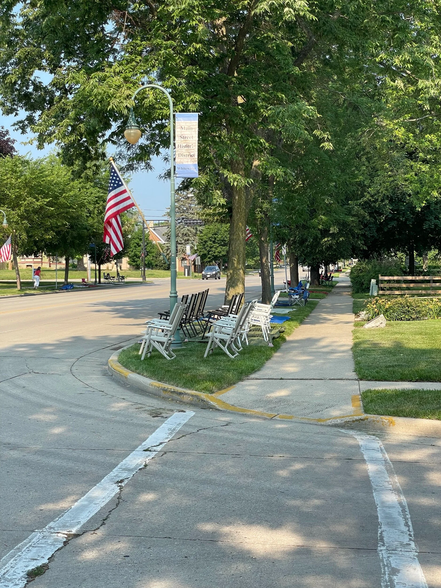 We walked down to the end of the block and then sat on the porch of the currently unoccupied sorority on the corner, in the shade, on chairs.
