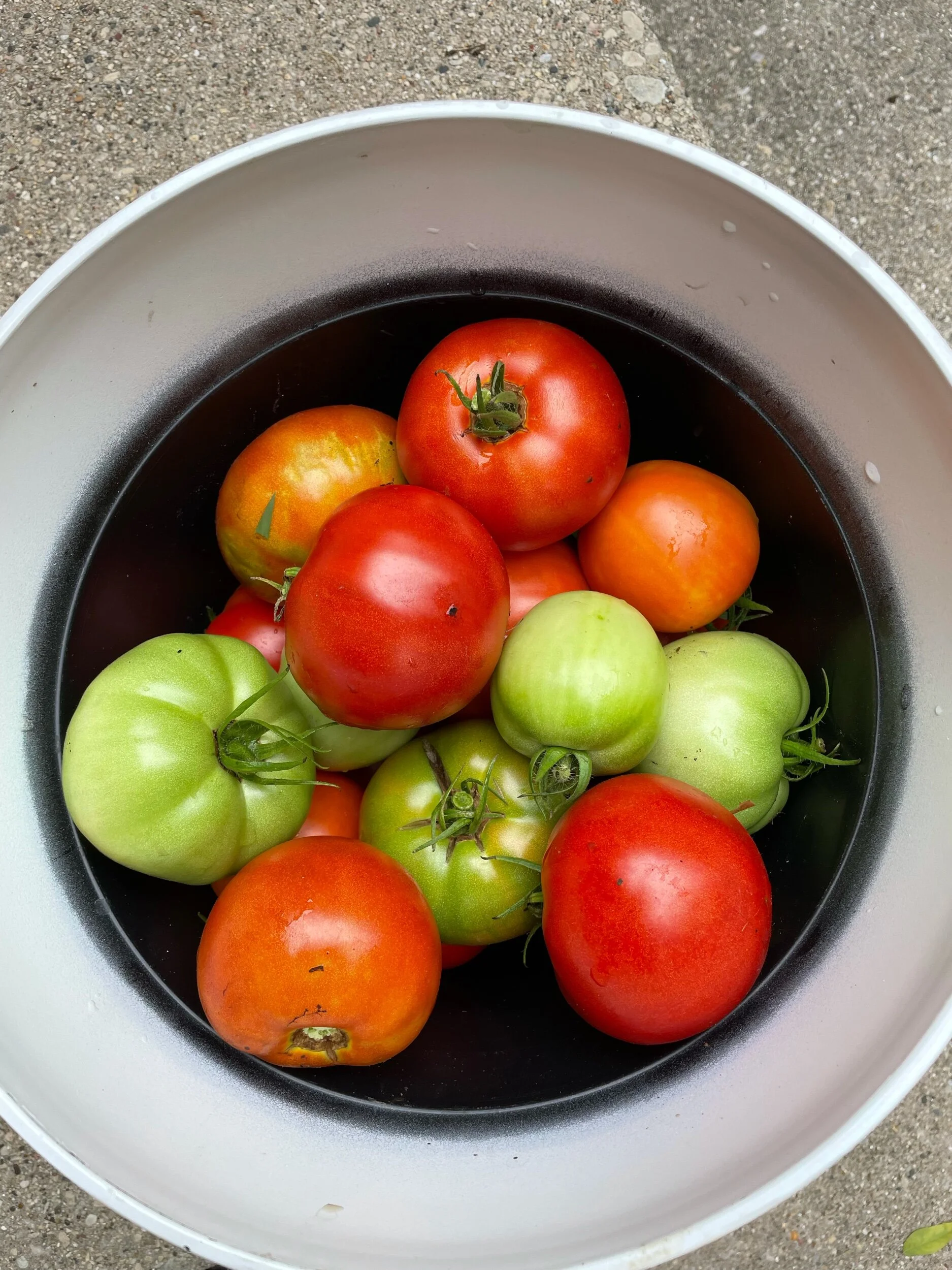 So much wind today it knocked over 4 tomato cages, shaking loose a few green fruit as well a a bunch of riper ones. (No damage to the plants, and the cages have been secured in their upright position. )