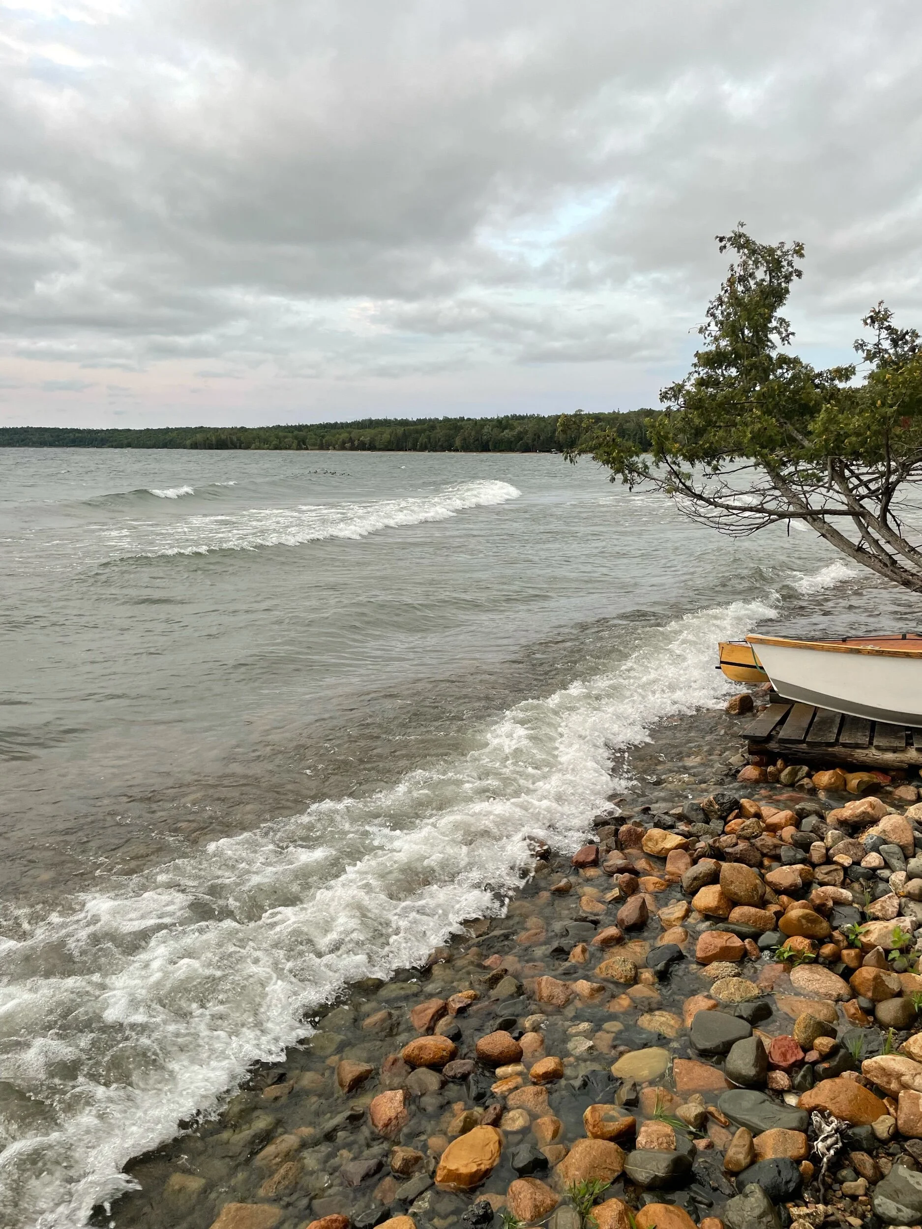 …a rustling in the trees and then the sound of surf, building to the roar of waves breaking on rocks. Bay has been a maelstrom ever since. Cool, with a little rain, which feels good after all the heat.
