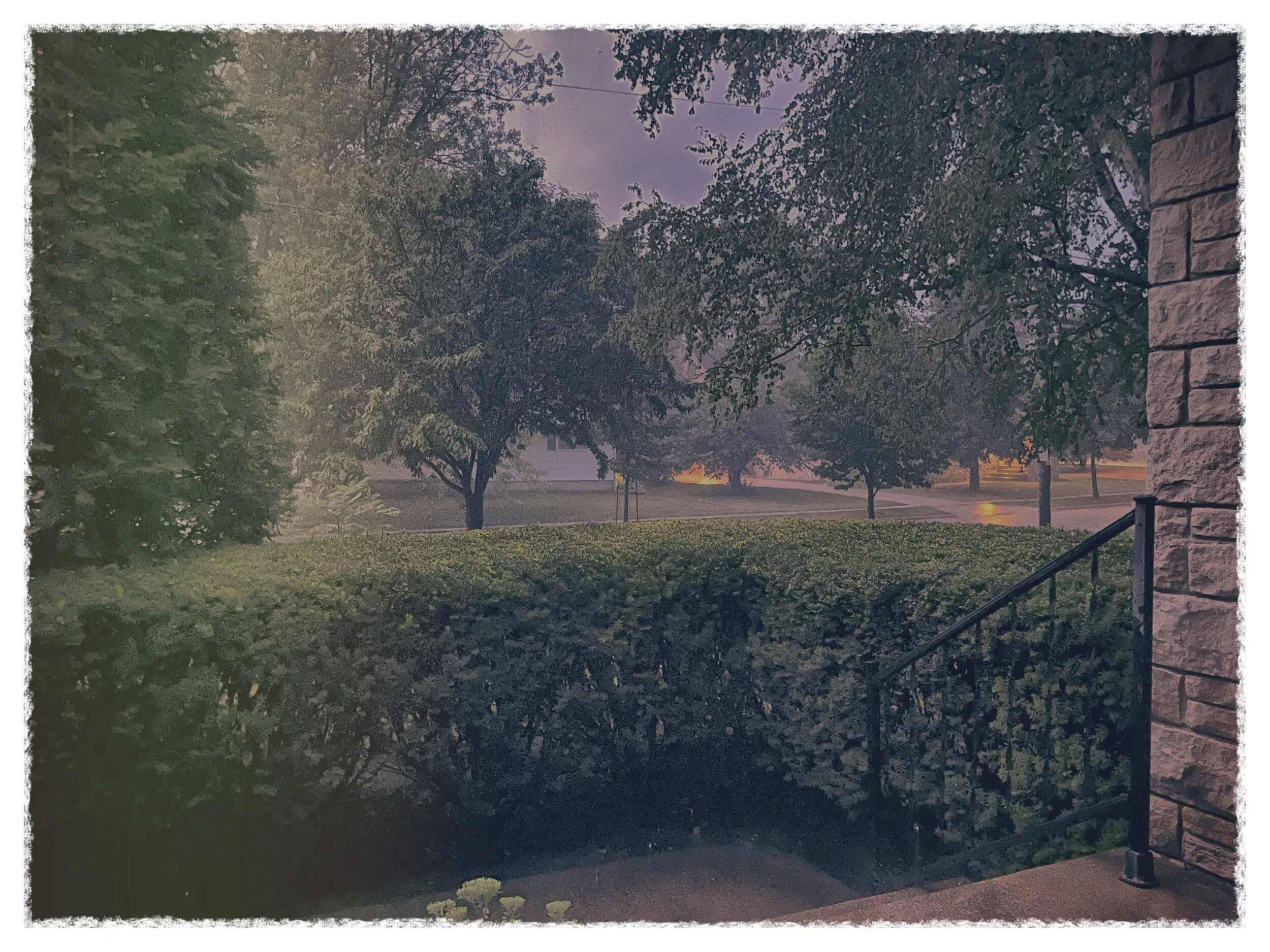But the thunder came back, along with lightning, and then rain. And for an hour we had a classic, old-fashioned duck drownder. You could almost hear the shrubbery sighing with relief. For once this summer, the epicenter of stormbogenesis was almost overhead.