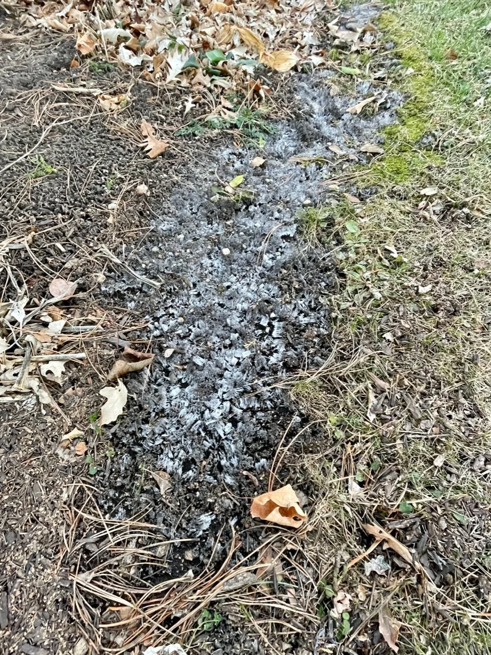 Big temp drop after last night’s deluge. The few remaining gutter leaves were flushed down the gutters and then flash frozen into hard wads at the end of the spouts. Lots of other little examples of frozen erosion on our afternoon walk around the block. (I made it all the way, though slowly.)
