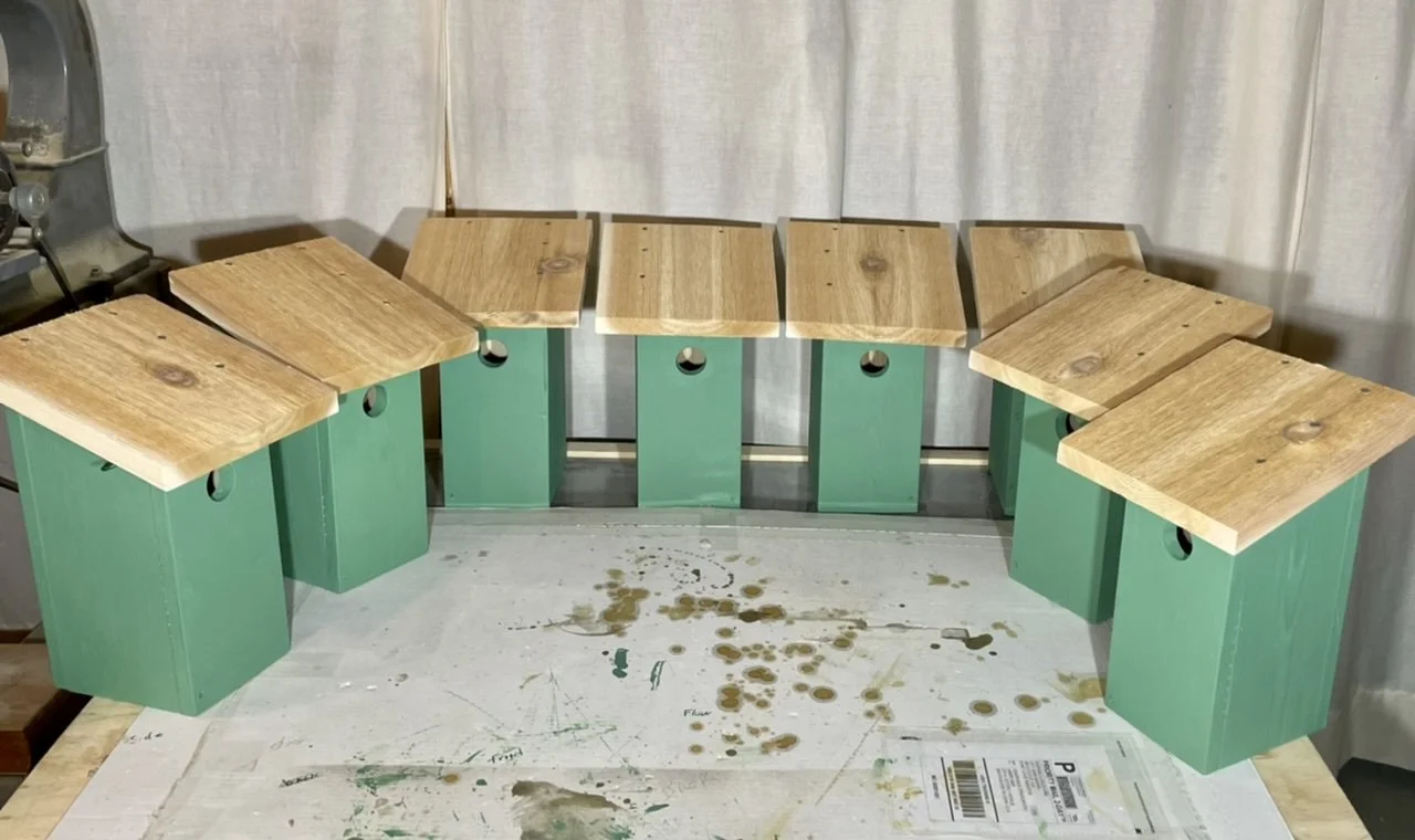 Bluebirds Times Eight February 08, 2022 by Jim Nies Bill and I finished construction of all 8 boxes. In some ways a fund raiser, in some way, for the birds.