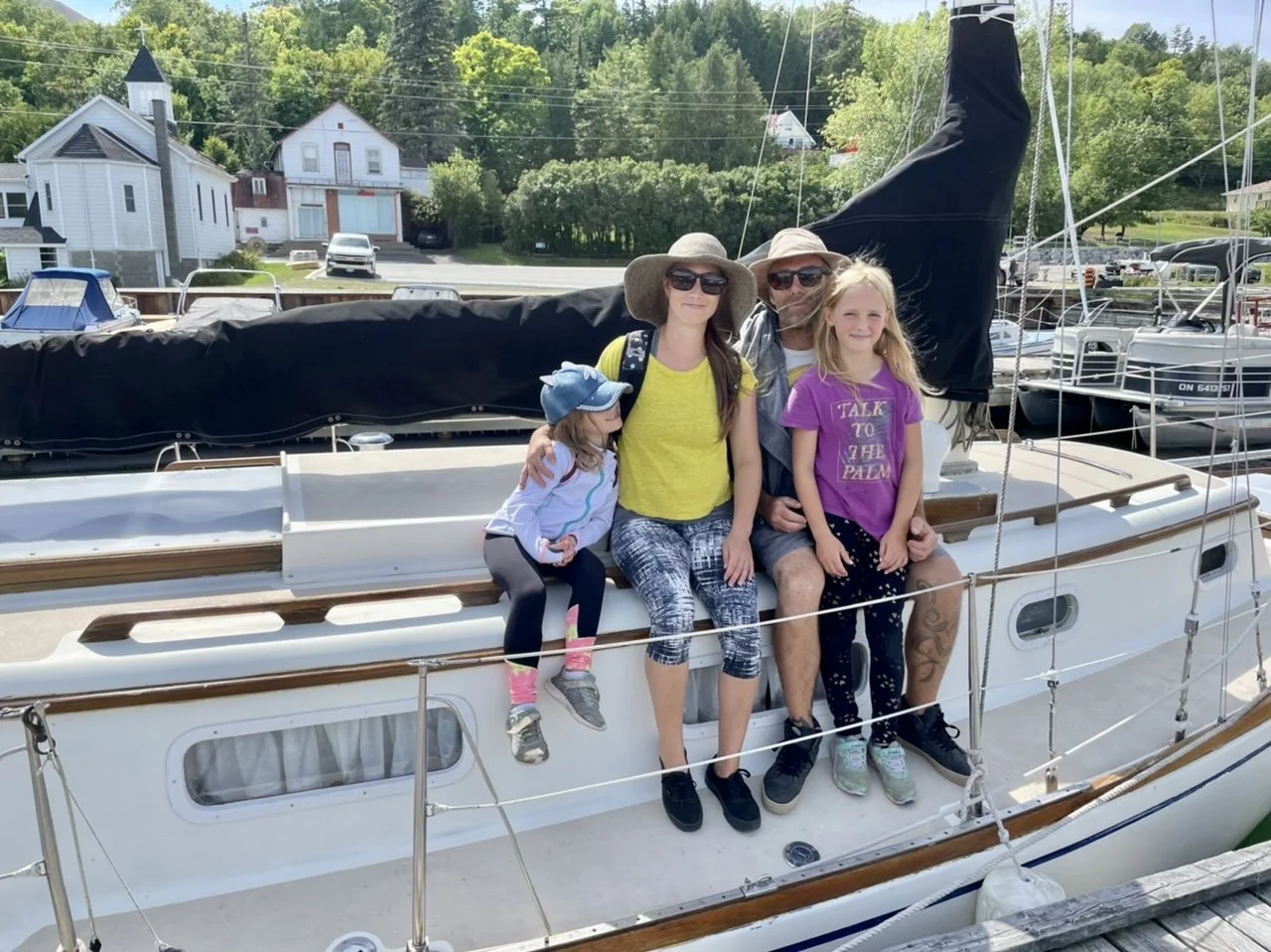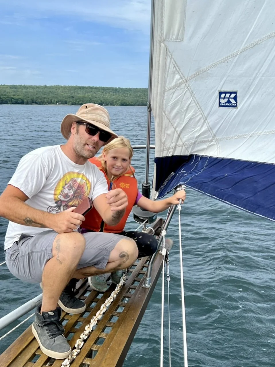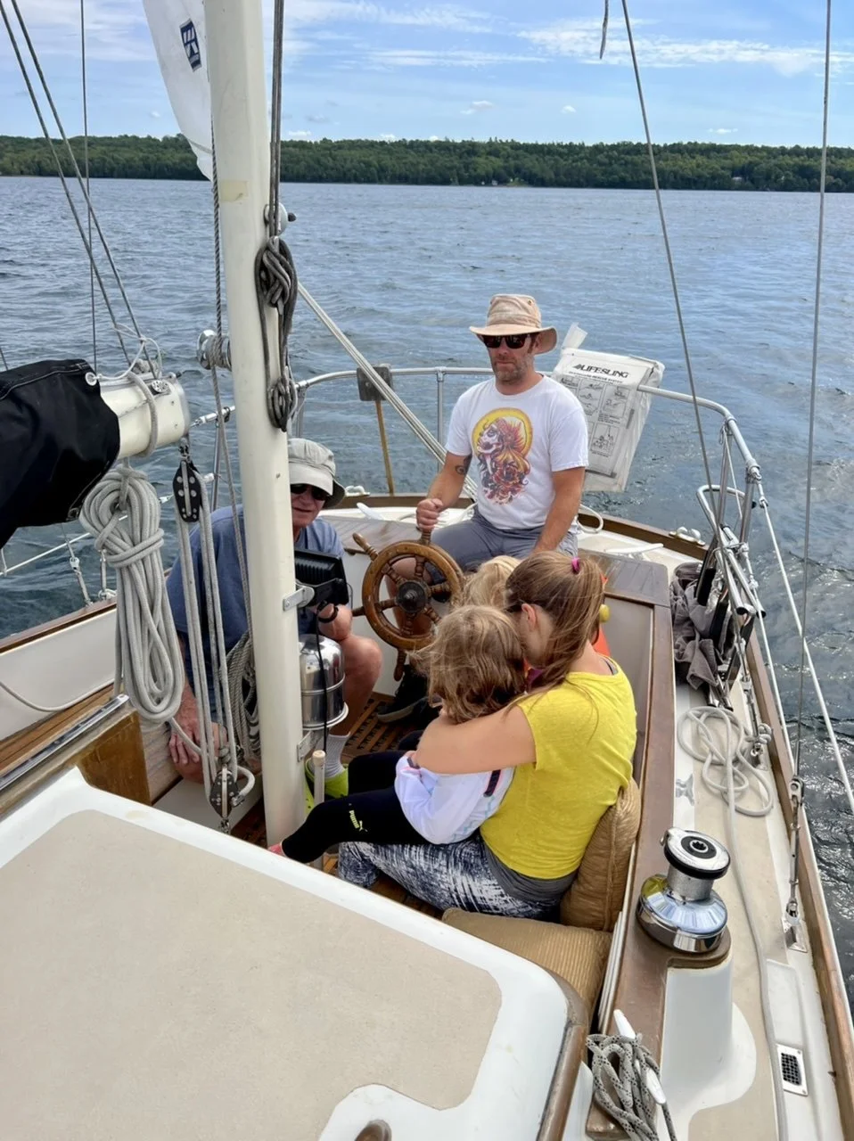Very breezy day; jib and mizzen only, but good fun—and the girls unfazed by motion or heeling.