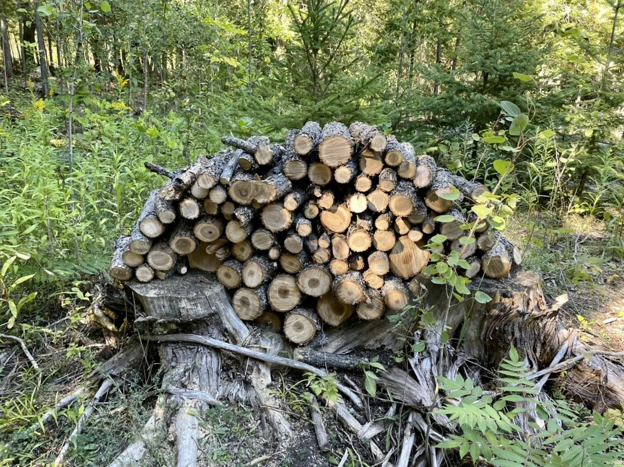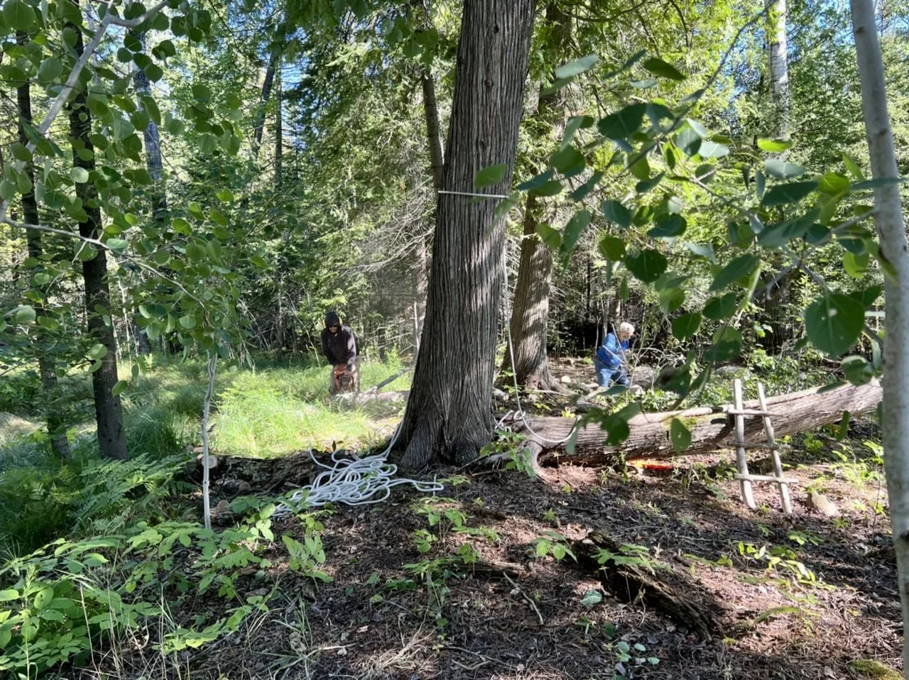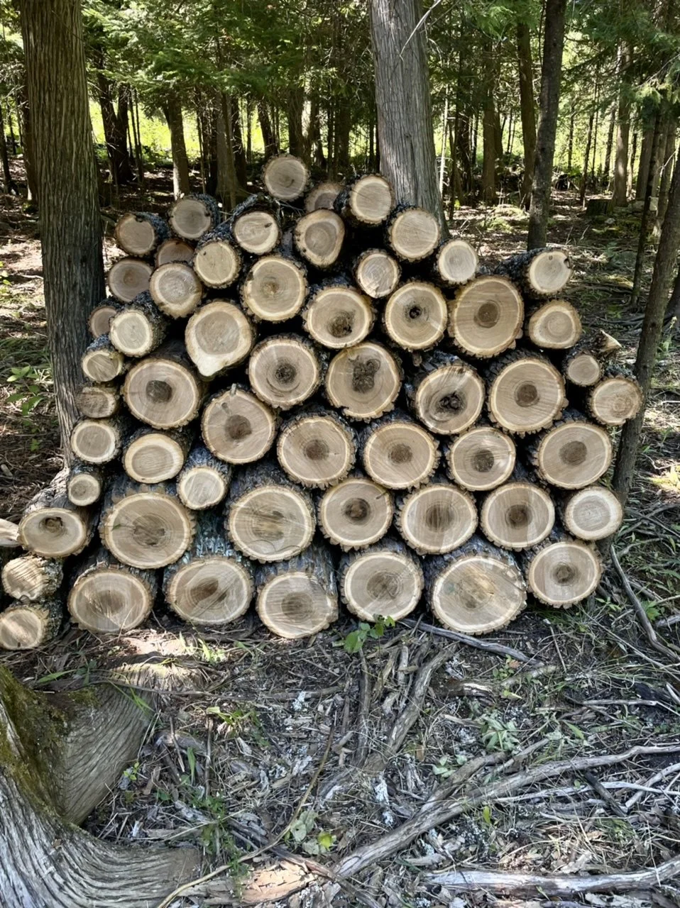 Working as a team, Mark, Sue, and I dropped, bucked, and brushed three spindly and moribund ash and one big, but dead, balsam. The place looks better, and we have years worth of firewood.