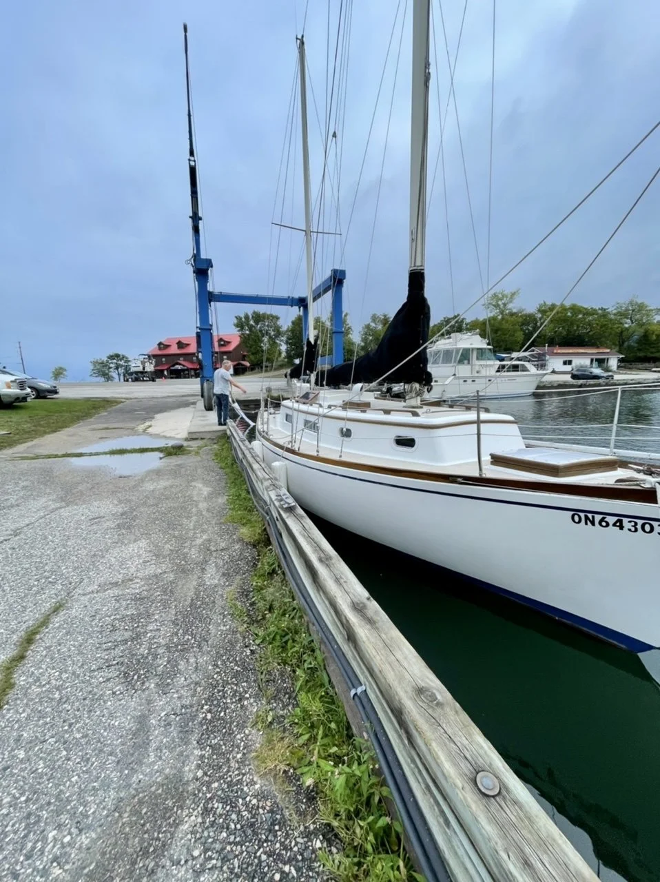 Helping move Heliotrope into the slings, I stepped backwards into the bollard (pictured below) and landed on my back in the puddle. Damage to the knee. Had to be lifted into the car. Sue came and took me to the Mindemoya hospital. X-ray showed nothing broken, and some range of motion is returning, so optimism prevails.