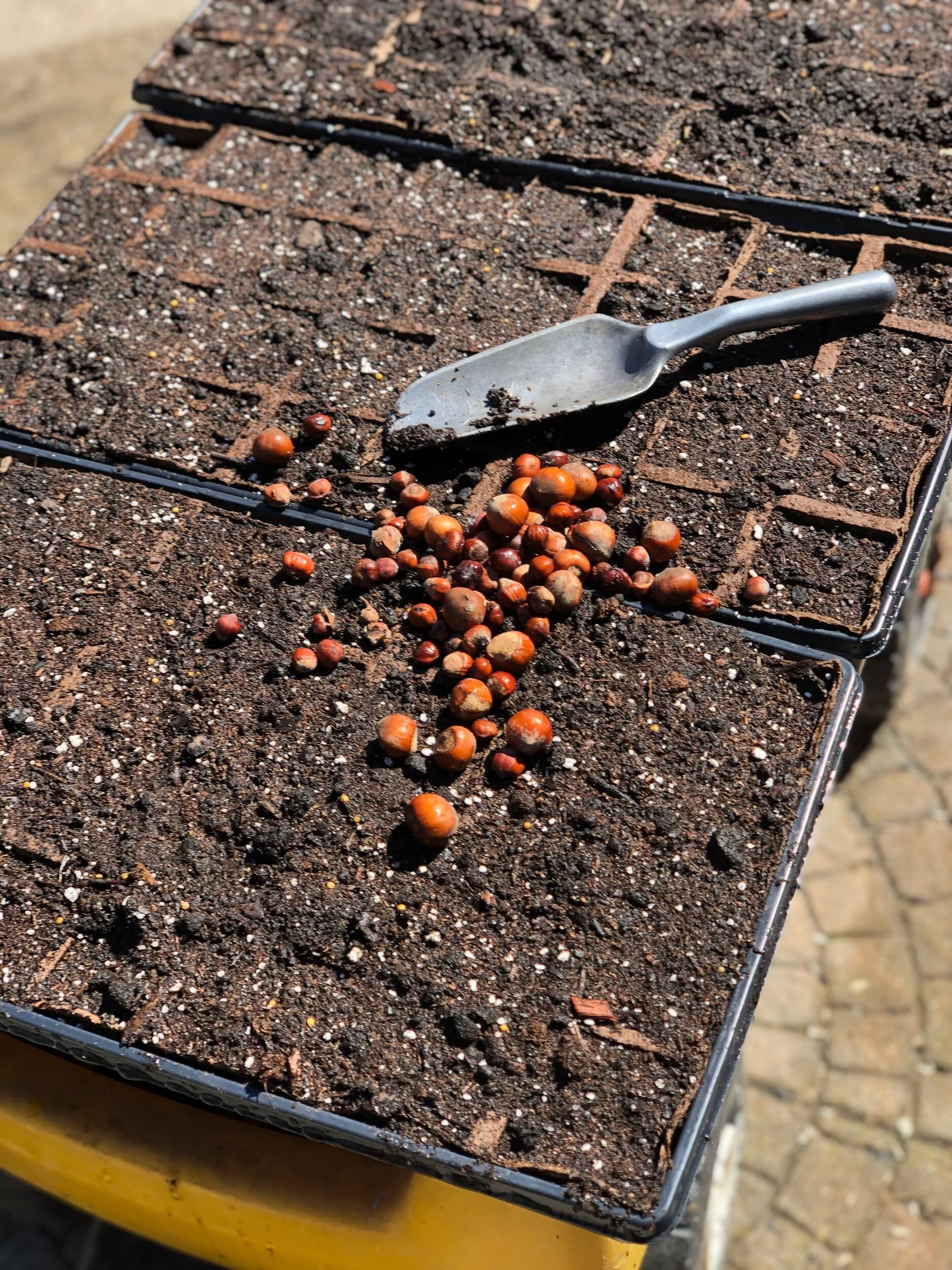 Meanwhile, about a hundred hazel seeds, after 6 weeks of stratification, were planted. If these sprout as hoped, I hope to plant them hither and yon, and distribute to anyone partial to hazel (Corylus avellana), which in my book is a fabulous big shrub or small tree. Nuts attractive to wildlife (including humans who sometimes call them filberts), and the best tree for coppicing (and thus making wattle hurdles).