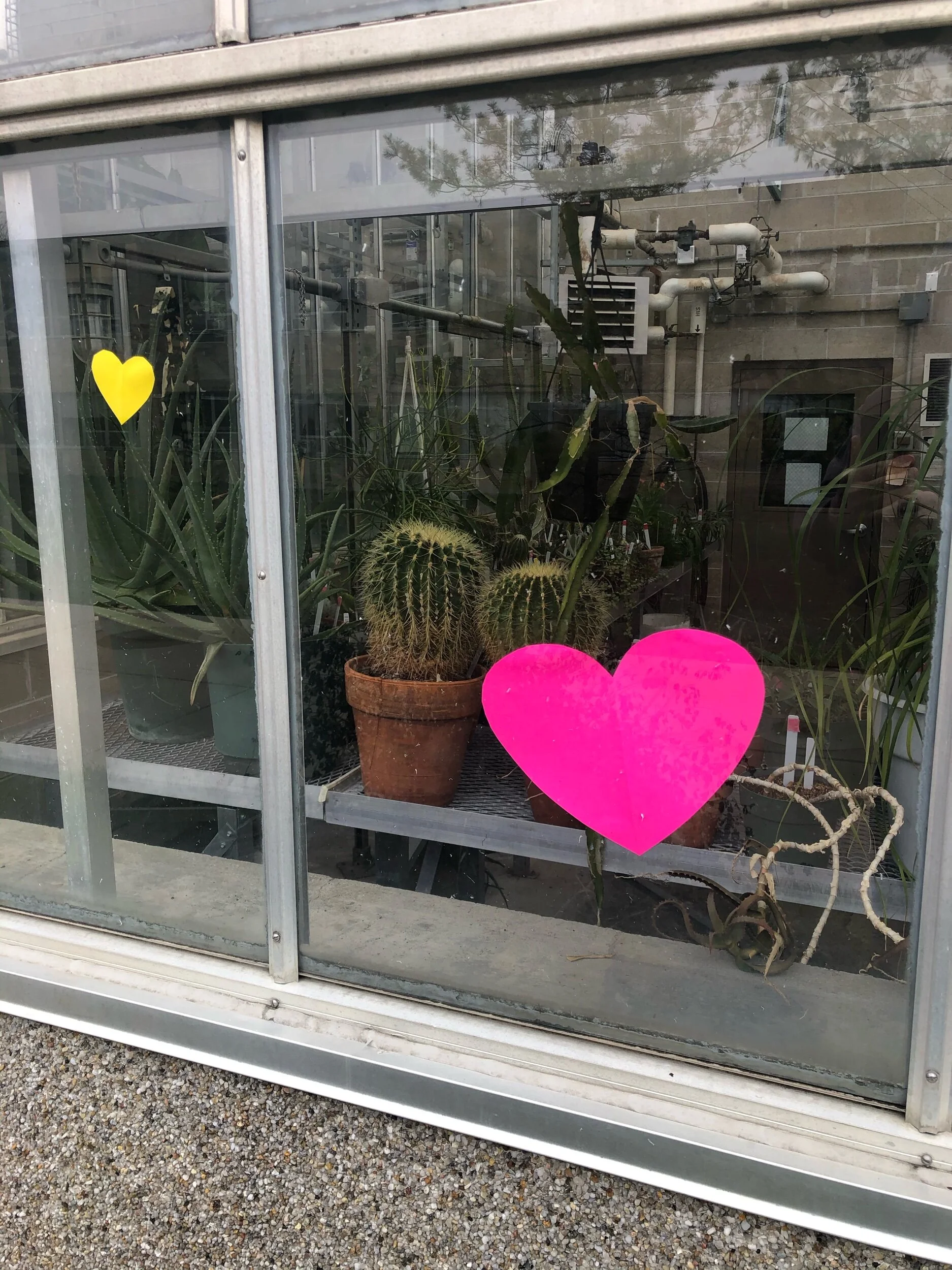 Hearts are everywhere around town (and all towns I do believe) as kids who are are cooped up have to cope. Surprised to find them in front of several cacti in the greenhouse on the UWW campus.