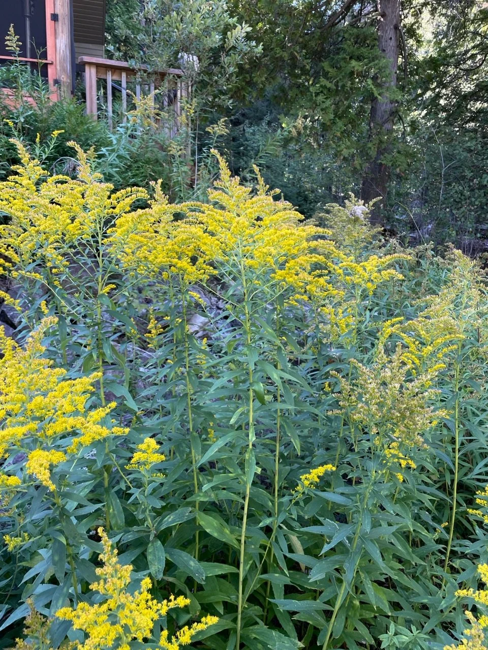 Limitless volunteer goldenrod, thrumming with life, right off the main deck. Perhaps a half dozen different pollinators very busy at work.