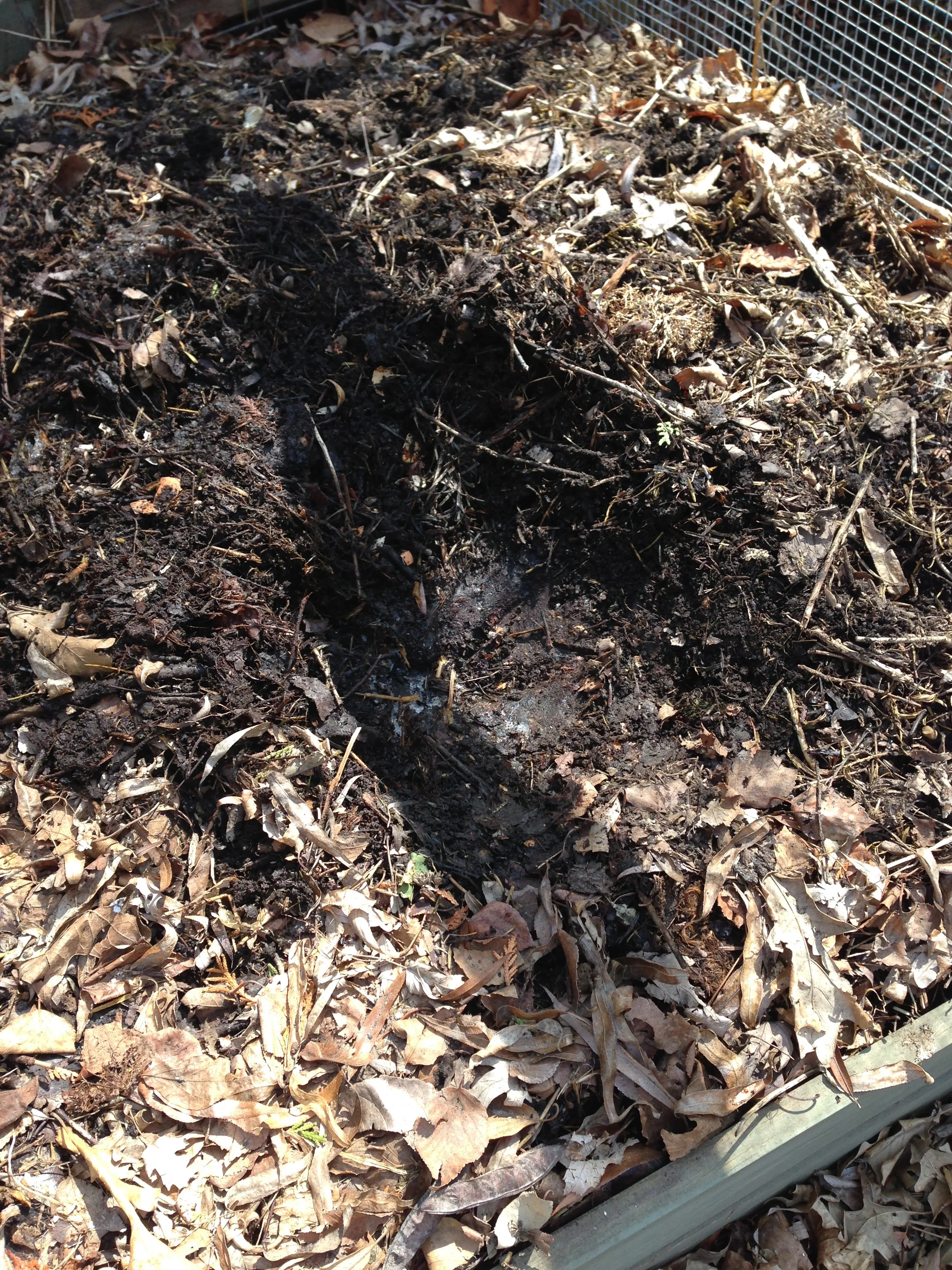 While I was in the garden I thought I'd rotate the compost—everything shifted one bin. Surprise, two inches down all frozen solid.